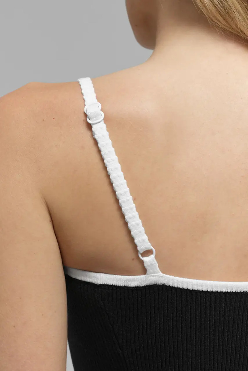 El corte halter con tirantes ajustables al cuello permite un ajuste personalizado para todo tipo de busto, mientras que el ribbed knit aporta un efecto visual que moldea y define la figura.