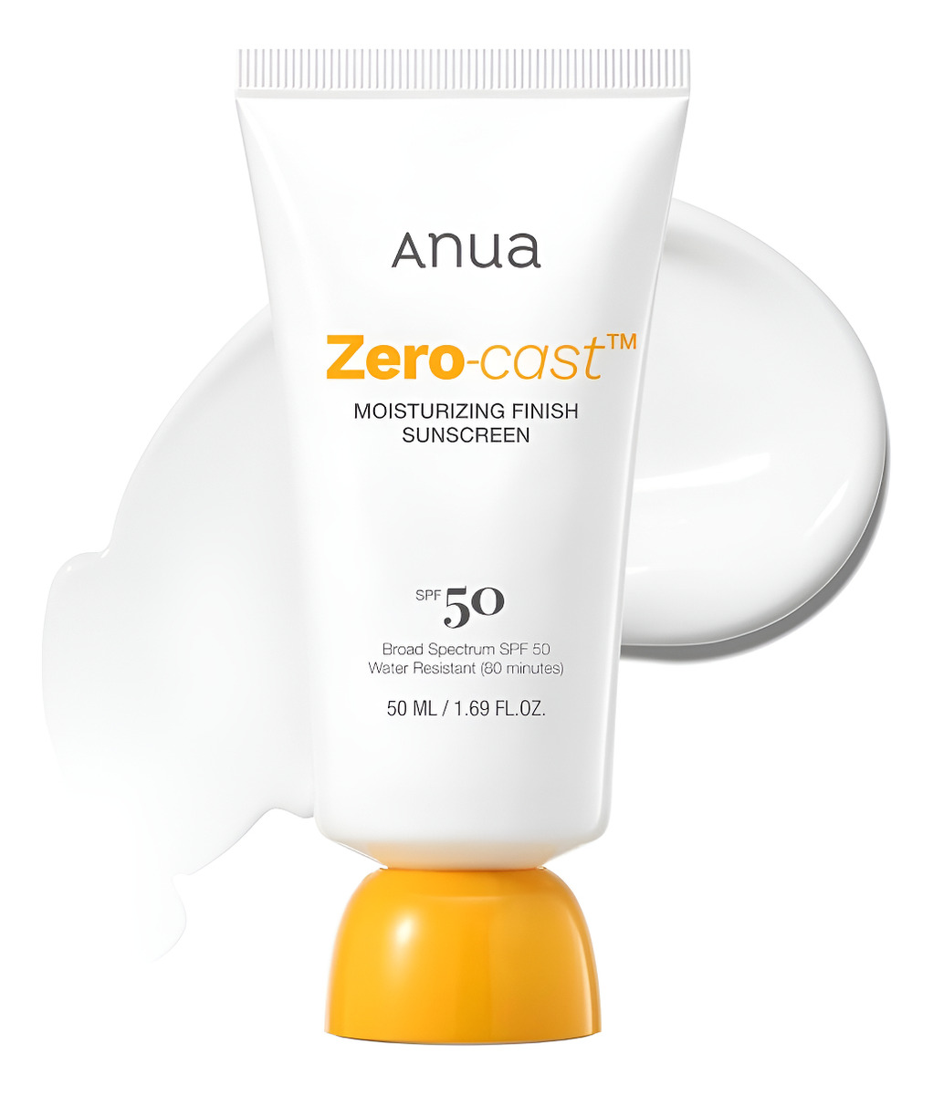 El Zero-Cast Moisturizing Finish Sunscreen de Anua es un protector solar facial coreano de uso diario que combina alta protección con un acabado hidratante y ligero. Su fórmula avanzada ofrece cobertura de amplio espectro contra rayos UVA y UVB, con SPF 50 y resistencia al agua por hasta 80 minutos.