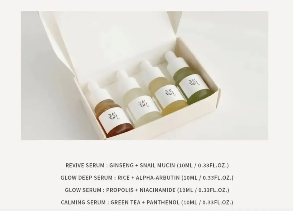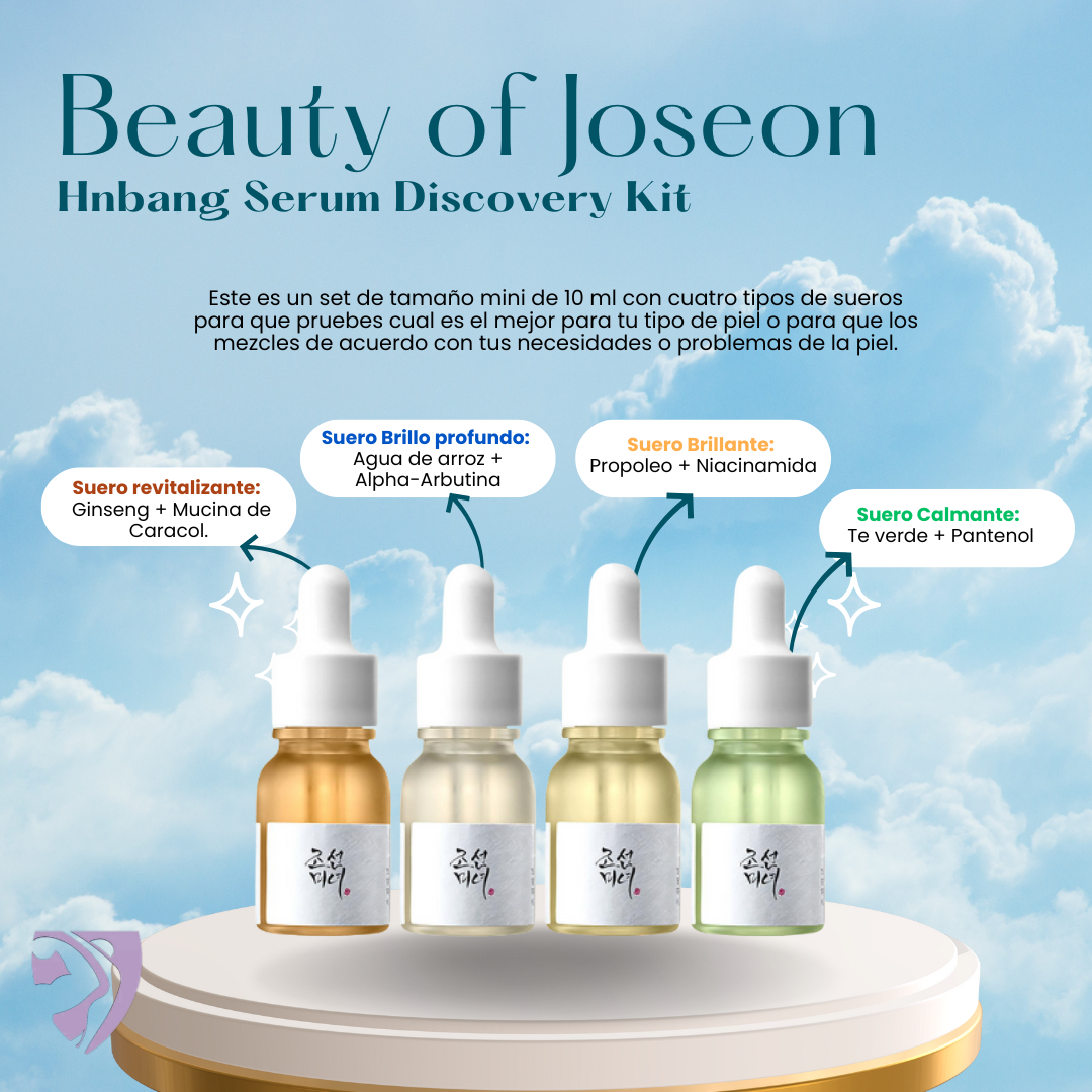 El Kit Hanbang Serum Discovery de Beauty Of Joseon es ideal para cualquier tipo de piel y puede ser utilizado tanto de día como de noche. Este conjunto incluye cuatro sérums de 10 ml cada uno:
