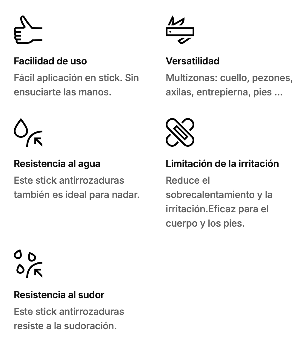 • Previene rozaduras, ampollas e irritaciones.