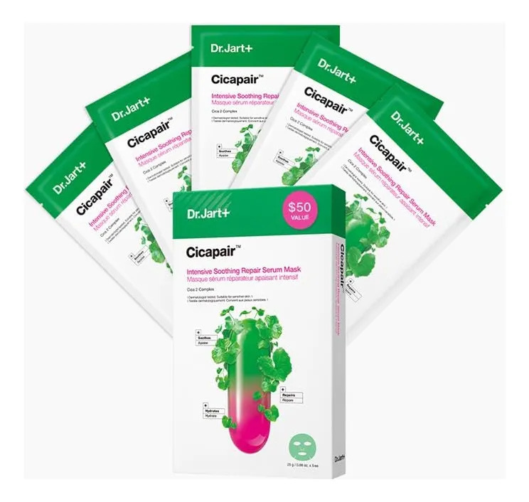 Dr. Jart+ Cicapair Intensive Soothing Repair Serum Mask, una mascarilla facial coreana especialmente formulada para pieles sensibles que necesitan alivio inmediato y una hidratación profunda.