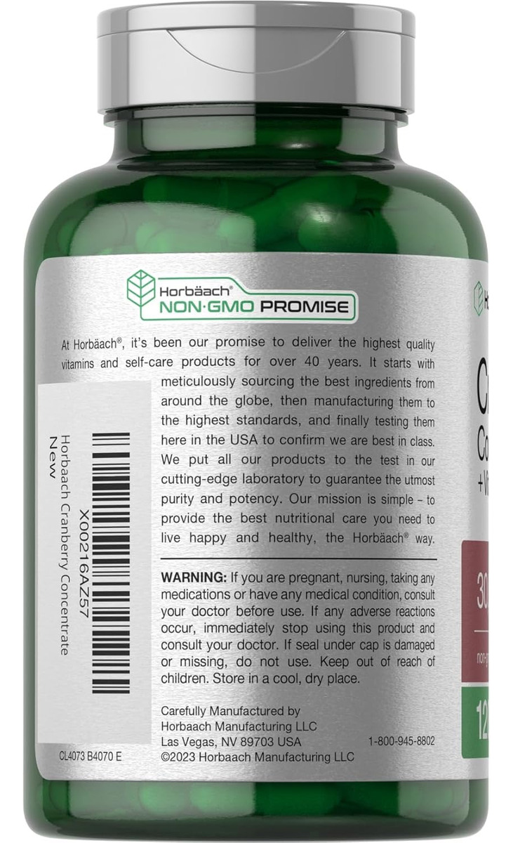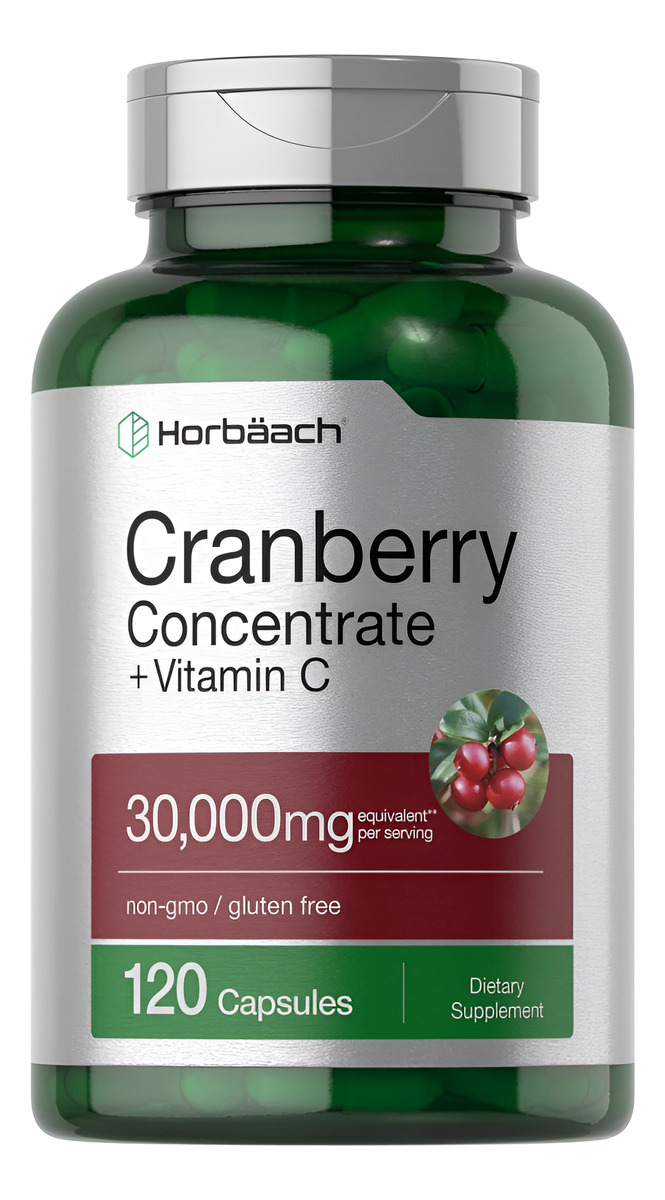 Horbäach Cranberry Concentrate + Vitamina C combina un extracto súper concentrado de arándano rojo (equivalente a 30.000 mg por porción) con 200 mg de vitamina C de alta potencia, ideal para reforzar el sistema inmune y cuidar la salud del tracto urinario.