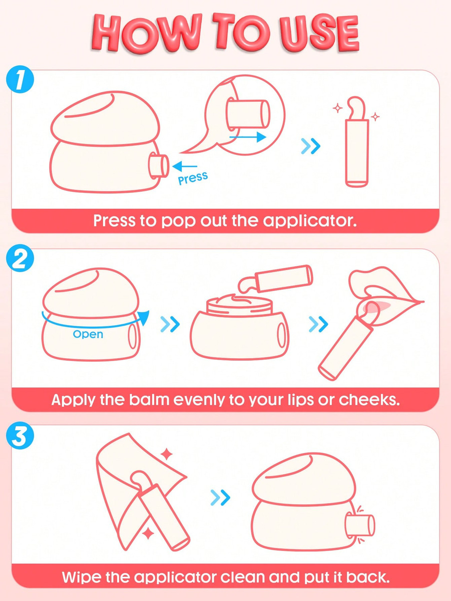 Presiona para extraer el aplicador, abre el envase y aplica el bálsamo de manera uniforme sobre los labios. Limpia el aplicador antes de guardarlo nuevamente.