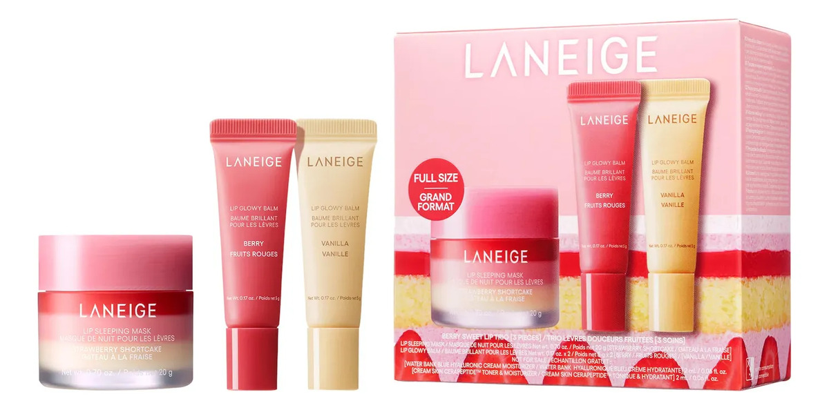 El set Berry Sweet Lip Care de Laneige incluye todo lo necesario para mantener tus labios hidratados, suaves y con brillo durante todo el día. Combina una máscara nocturna intensiva con mini bálsamos para uso diario, ideal para una rutina completa de cuidado labial.