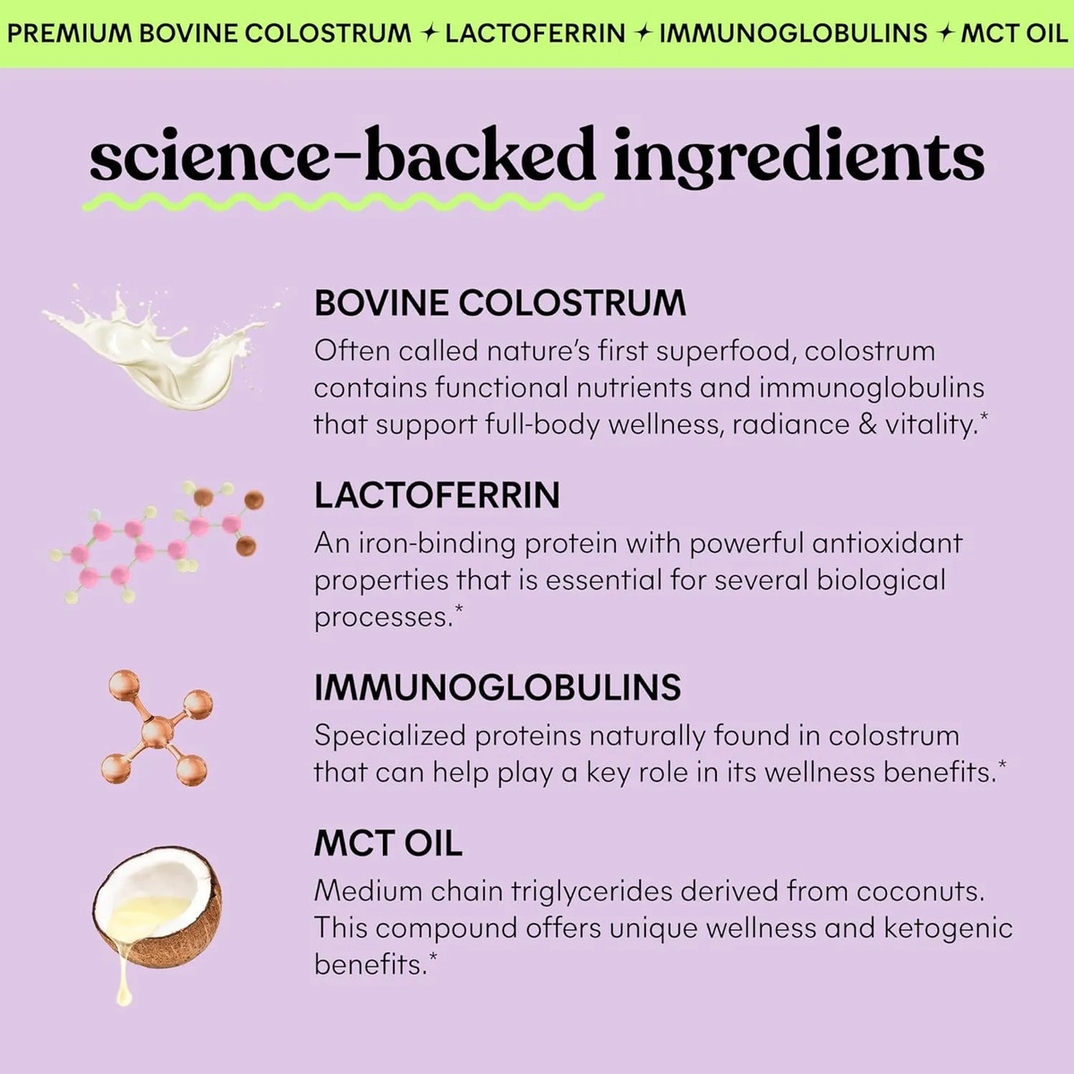 Este suplemento está elaborado con colostro bovino de vacas alimentadas con pasto, estandarizado con inmunoglobulinas y lactoferrina, compuestos conocidos por su apoyo al sistema inmunológico y digestivo. Además, contiene MCT oil y vitamina E, un potente antioxidante que ayuda a combatir los radicales libres y a proteger la piel del estrés oxidativo.