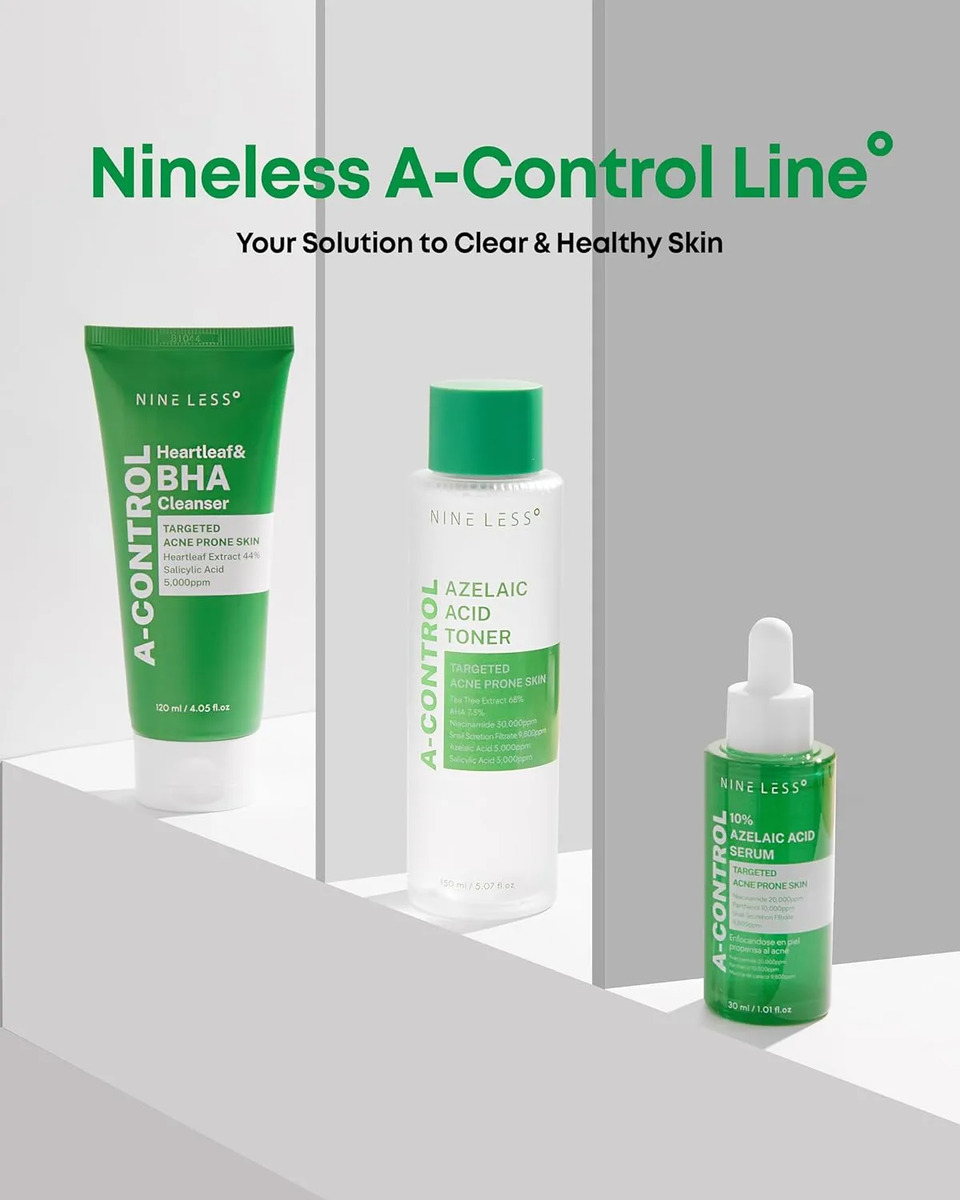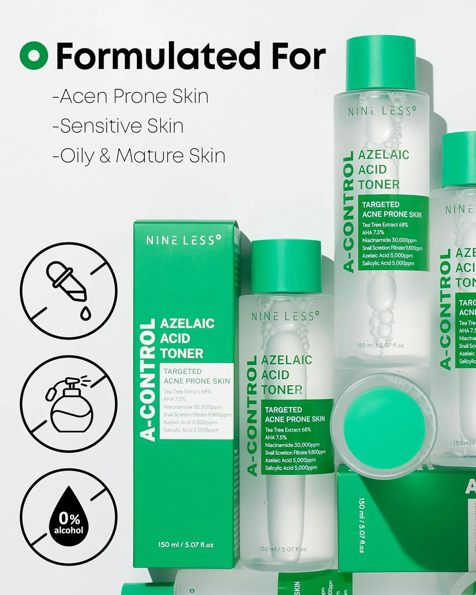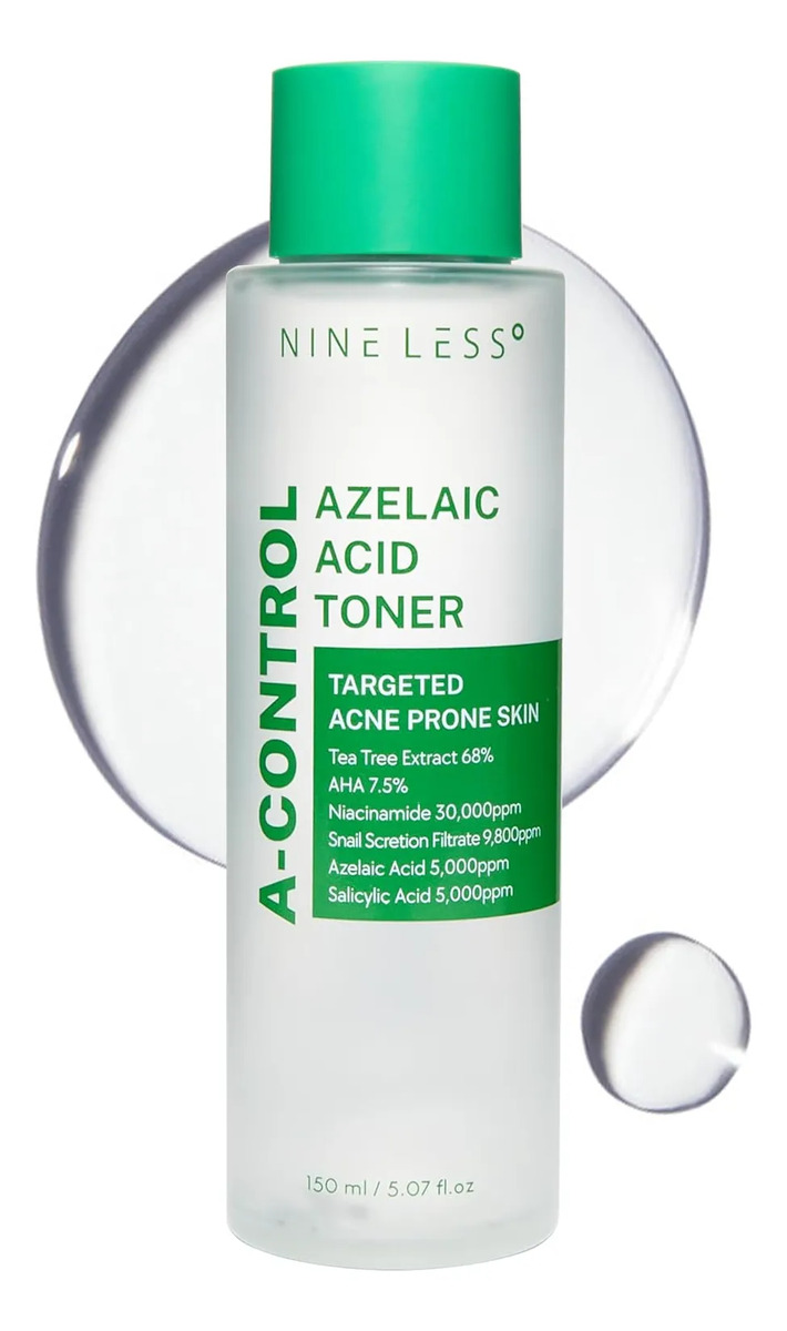 El Nineless A-Control Azelaic Acid Toner es un tónico facial coreano de textura ligera formulado con una poderosa combinación de ácidos AHA, BHA y ácido azelaico. Diseñado especialmente para pieles con tendencia al acné, este tónico exfolia suavemente, limpia los poros y mejora visiblemente la textura de la piel sin causar irritación.