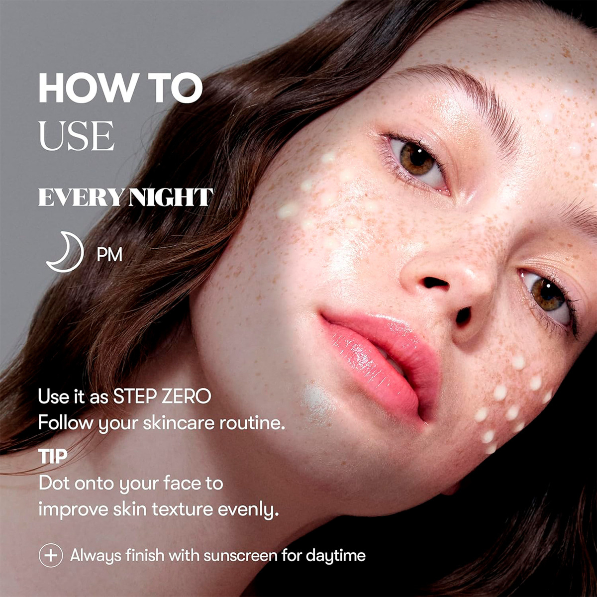 1. Aplicar una cantidad adecuada sobre el rostro limpio, en la rutina de skincare nocturna.